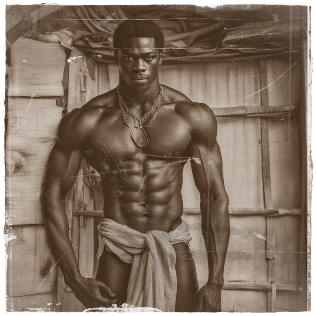 Again, André repressed a gasp of surprise, scanning the muscular body in front of him. The Negro was so massive and tall that, if he wasn’t tightly bound, he could’ve easily broken André in two with his bare hands. The bulging pecs were round and beefy, crowned with unusually meaty nipples surrounded by wide black areolas; the abs were ripped, and the muscles, twitching for the tension, were clearly visible under the caramel skin. Moving his gaze downward, André fixated his eyes on the slave’s impressive manhood, a thick, veiny tube of black meat more than ten inches long, completely covered with a long foreskin and resting on a hairless ball sac so plump and heavy that it seemed to contain two croquet balls rather than male gonads.