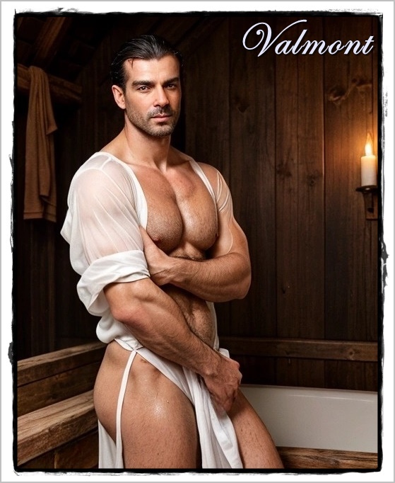“Don’t worry, Valm…” – the Marquis began to reply, but the voice died in his throat as soon as he lay his gaze over his friend. The long brocade robe didn’t have a belt, and the front opening gave to the guest a clear view of Valmont’s chiseled body, as well as his manly attributes, erotically half-hidden under the wet bath gown. Merteuil gulped down a couple times, before finding enough voice to murmur: “I… I’m terribly sorry, Valmont, I should have not barged in this way, unannounced. I see you were still doing your morning toilette… I… uhm… didn’t expect you to show up so… erm… underdressed.”
