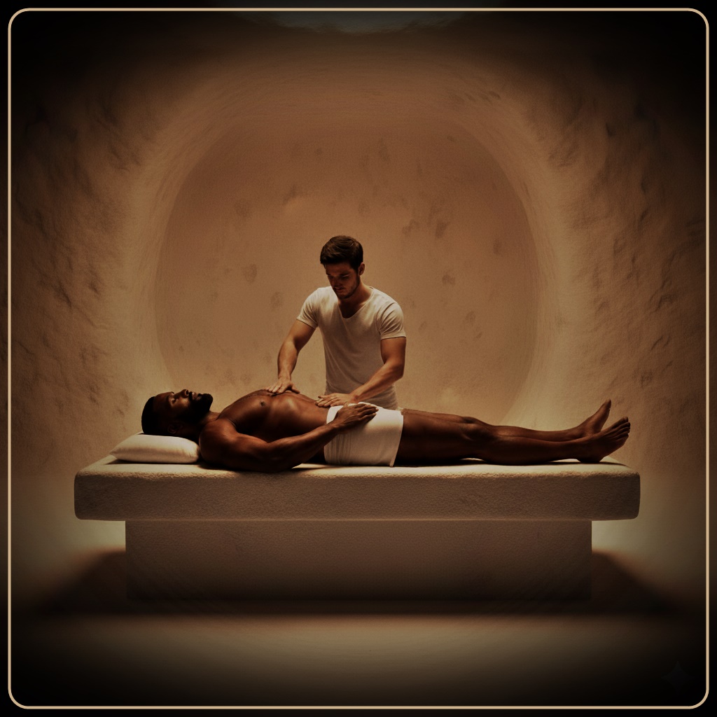 “Am I supposed to do something?” – Jason timidly asked, ashamed for not knowing what a helper’s duty was. Deimos smiled and replied with a friendly tone: “It’s easy, don’t worry. First off, you should remove my loincloth, and then I’ll lie down on the table and you’ll… uhm… help me get ready for the Insemination. It’s not a difficult job, but it requires some sensibility, because the helper should make the husband feel aroused, almost ready to give his load, but without making him waste his seed. Don’t worry, I will guide you. Let’s start with the loincloth.”